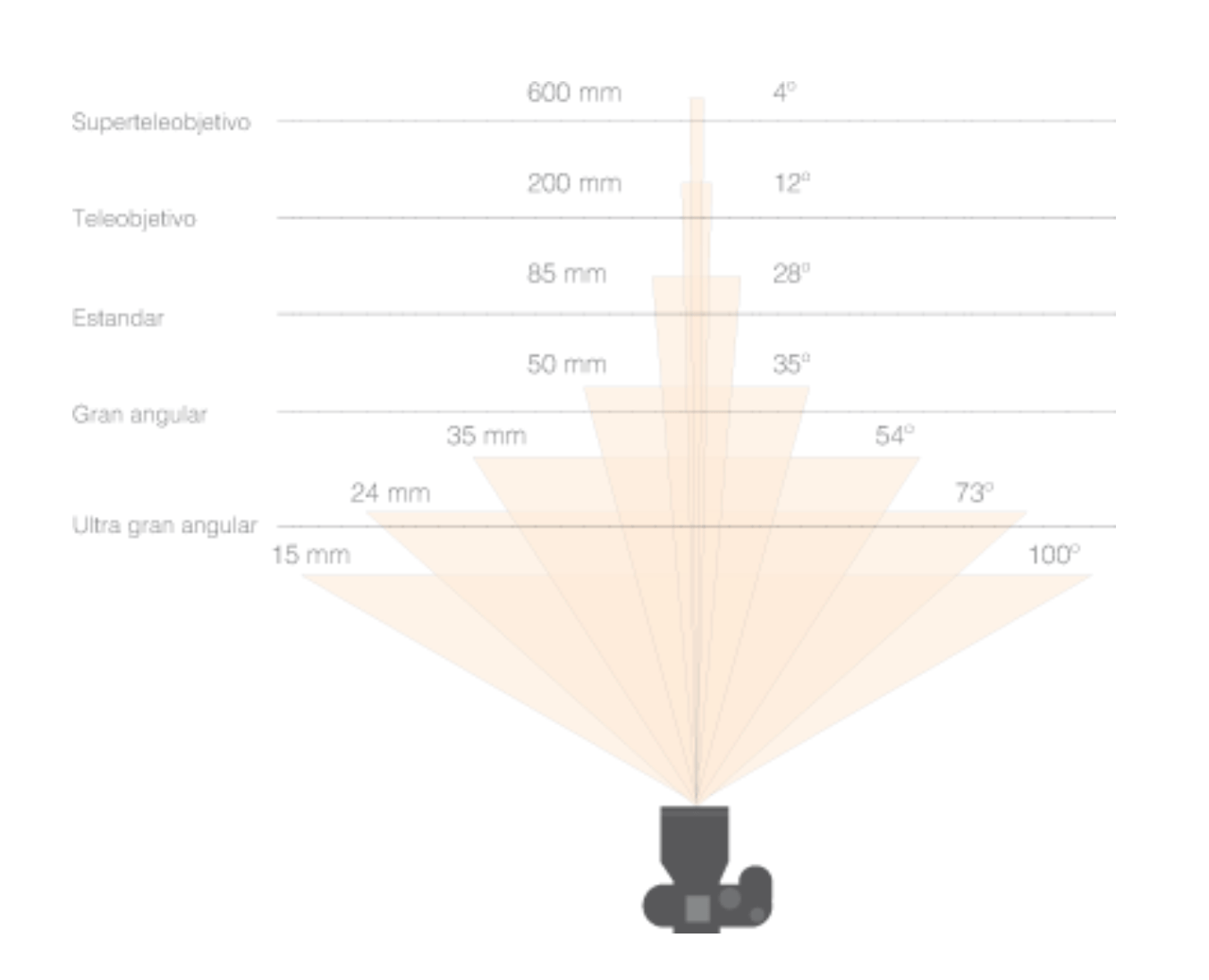 Empecemos por entender esta separación de categorías. Cuando hablamos de "angular" nos referimos directamente al ángulo, y más concretamente a un ángulo abierto. Por ejemplo una lente de 15mm ofrece un ángulo de 100º, mientras que una lente de 24mm 73º. Ambas lentes son angulares, pero hay una relación directa entre la distancia focal "milímetros" y el ángulo de visión que ofrece el objetivo.