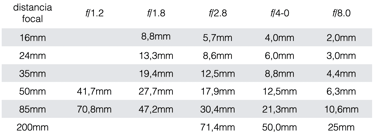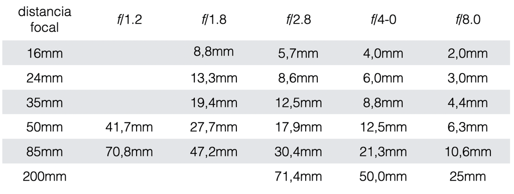 En esta tabla podemos observar la relación de los números f y la distancia focal, esto nos ofrece un seguido de números en mm que son los diámetros de apertura.