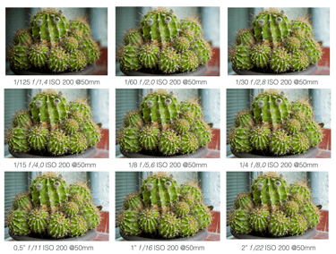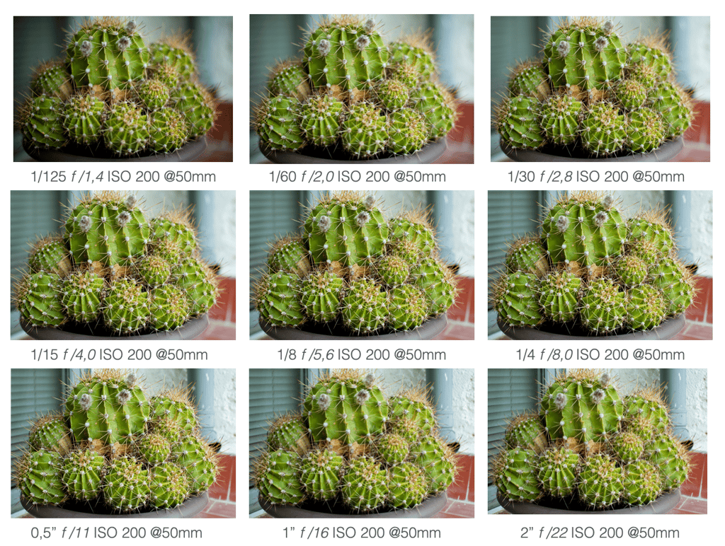 En esta tabla, podemos ver gráficamente como desde arriba a la izquierda a f /1.4 no hay detalle en el fondo, ganando protagonismo el cactus. Hasta abajo a la derecha a f/22, donde tanto como cactus y ventana tienen detalle. Hay una diferencia de 8 pasos y de la primera imagen a la última y hay 8 veces menos luz.