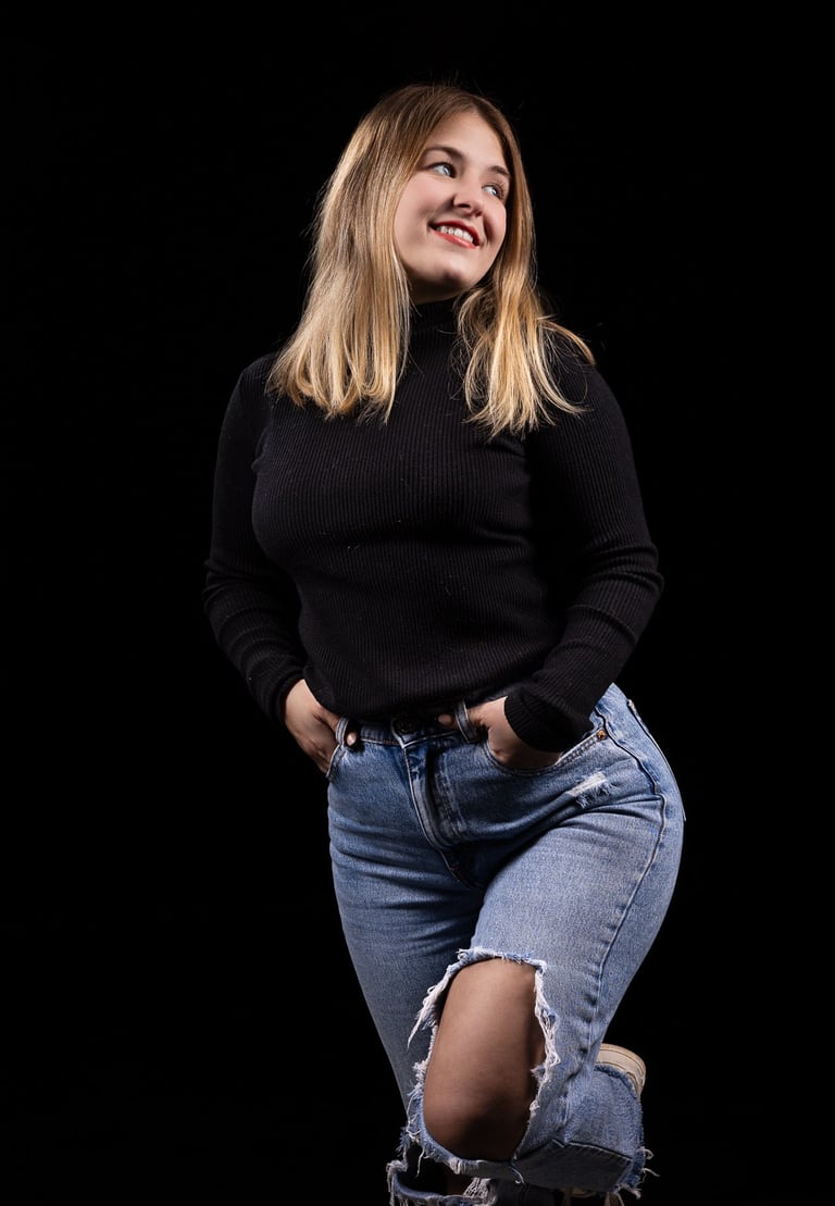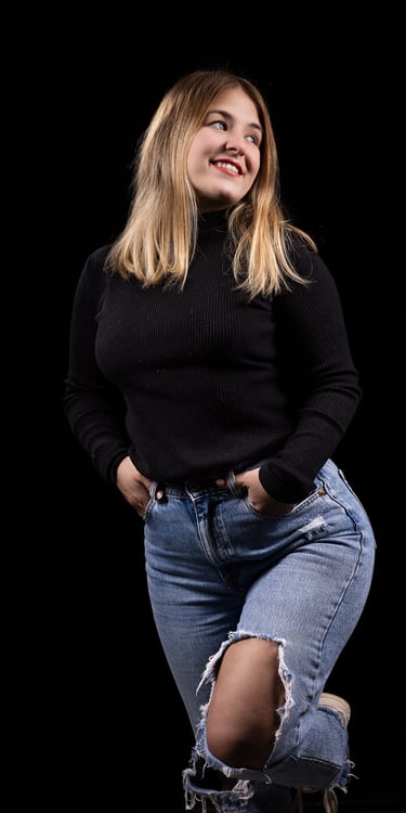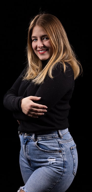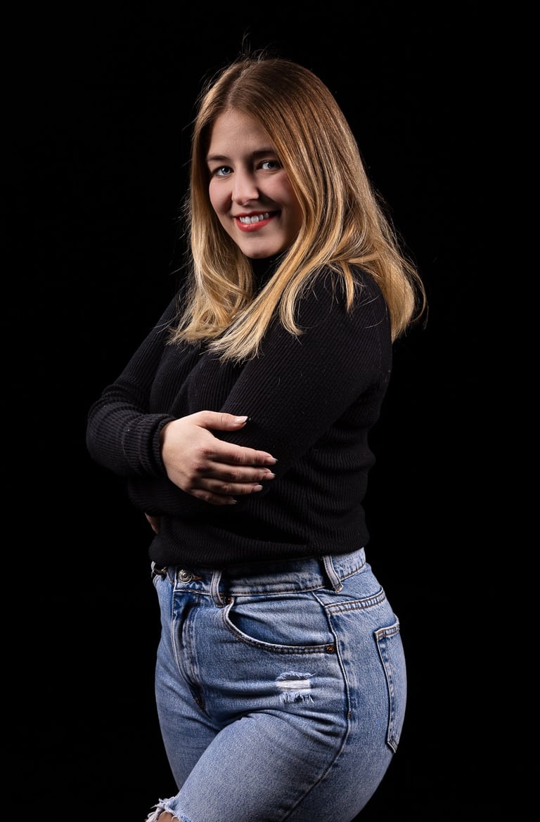 En estas imágenes, nuestra modelo esta muy cerca de los puntos de luz y muy apartada del fondo. Esto sumado a la direccionalidad, cobertura de la luz y como actúa la ley de la inversa del cuadrado hace que tengamos un fondo totalmente negro.
