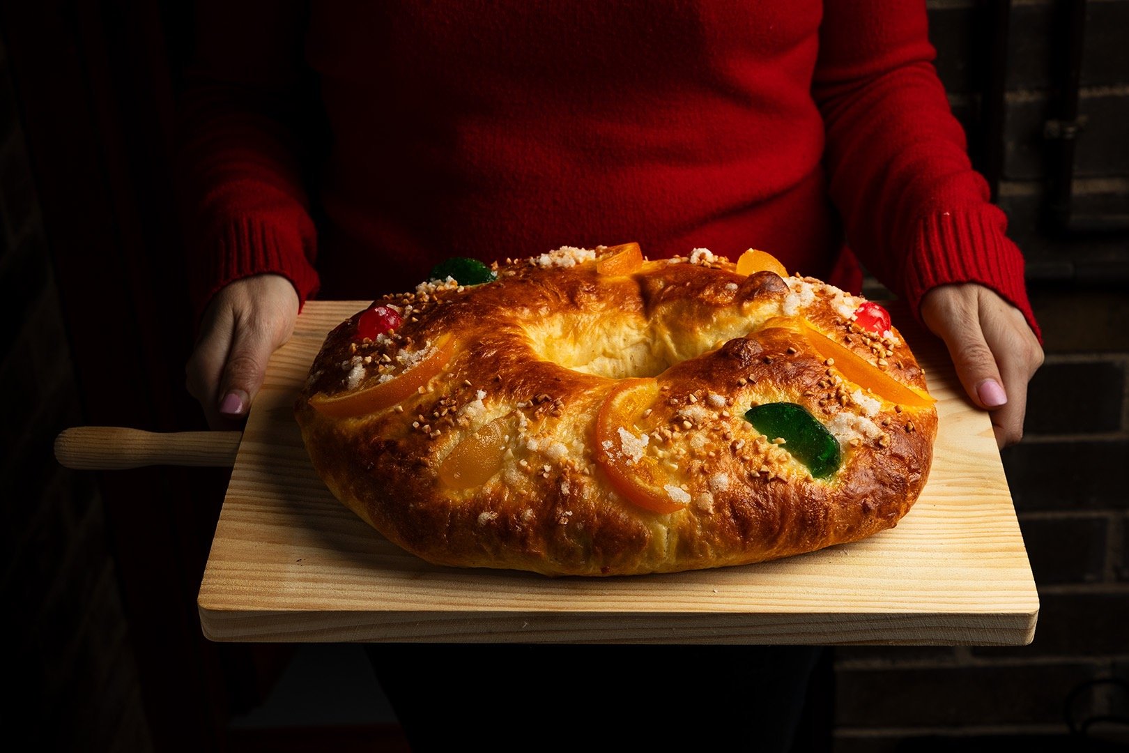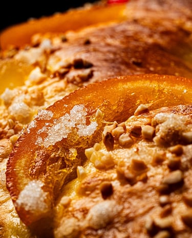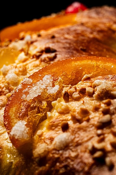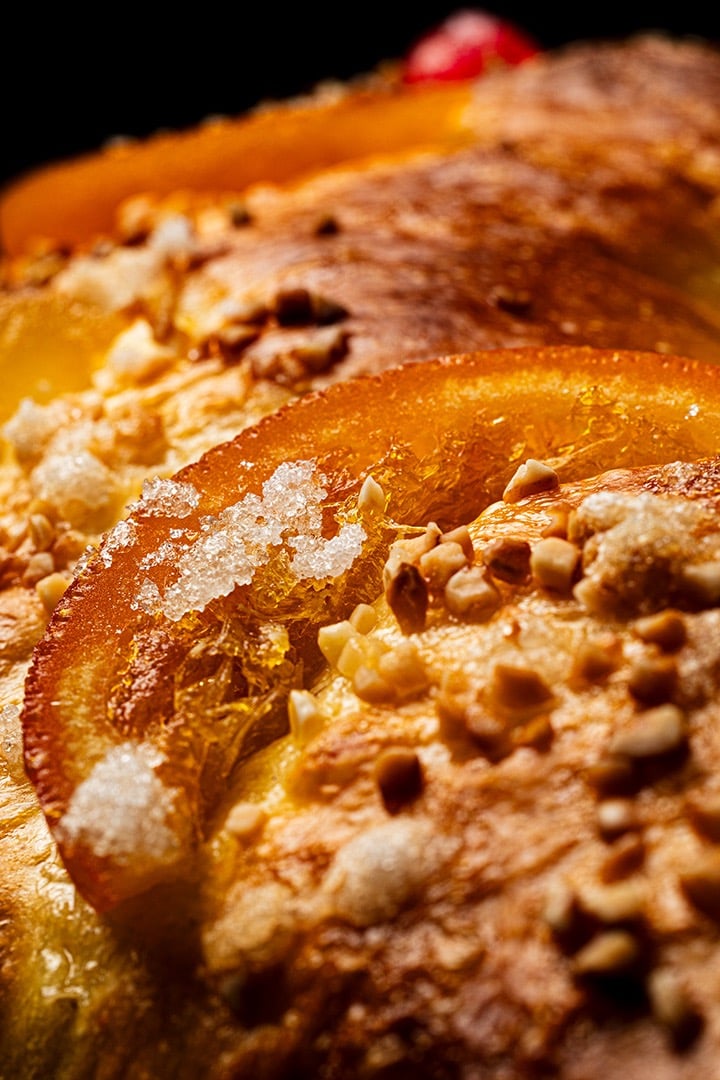 Se centra en un aspecto particular del plato o un ingrediente específico. Este plano es ideal para destacar texturas, colores y detalles sutiles, como el azúcar, el crocante y la frutas confitadas de este roscón de reyes.