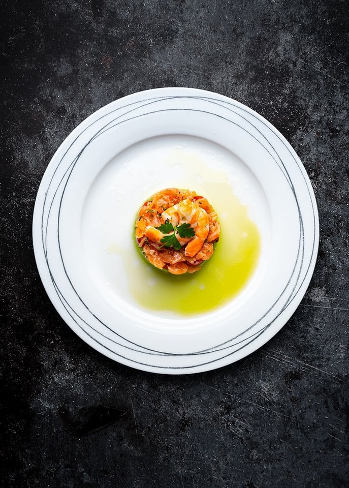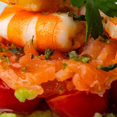 Tartar salmón ahumado con guacamole y gambas con vinagreta de limón, aceite oliva y miel.