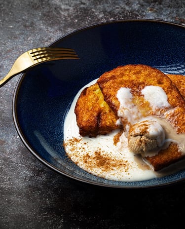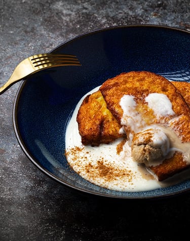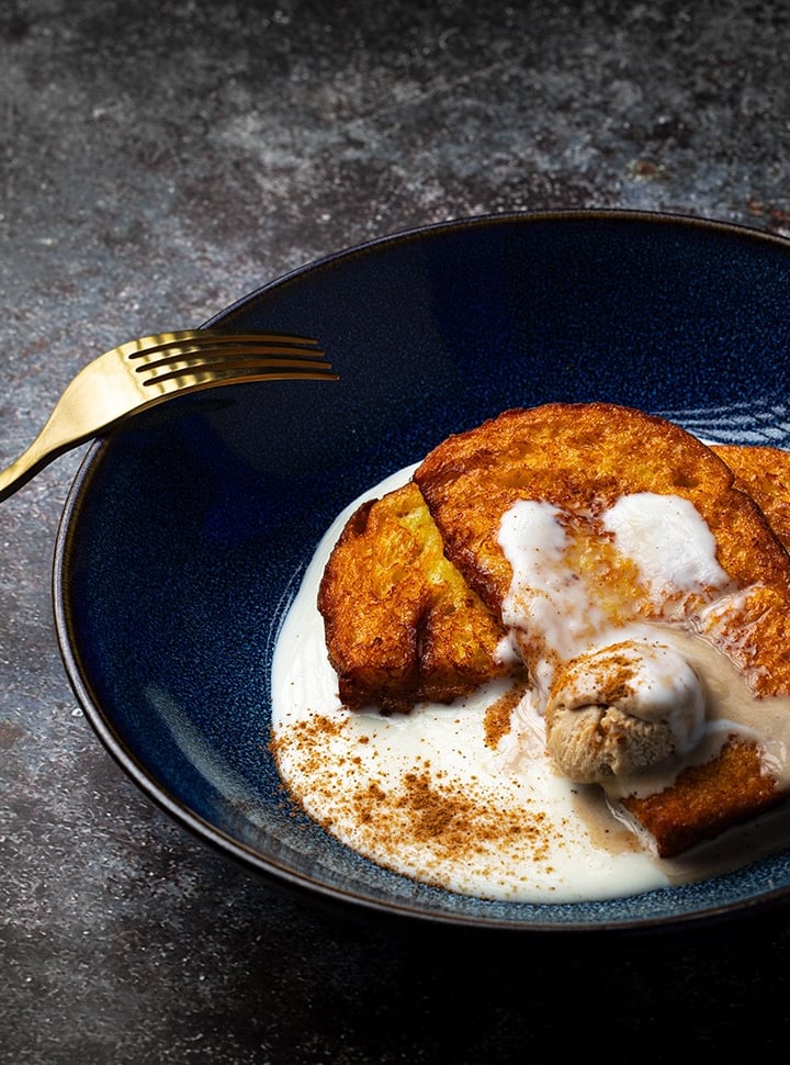 Torrija de brioxe con salsa de leche merengada y helado de turron