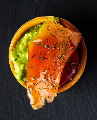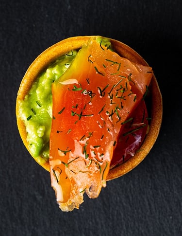 Cazuelita aguacate, cebolla, tomate cherry y salmón ahumado.
