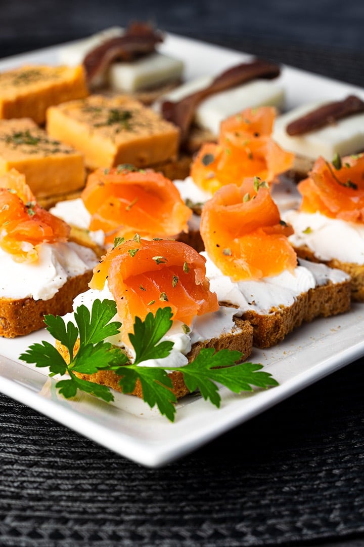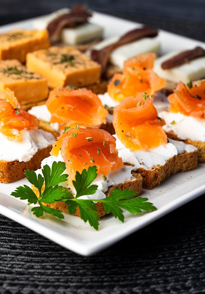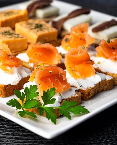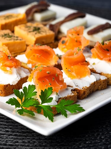 Torraditas queso crema con salmón ahumado y eneldo, torradita queso oveja con anchoa, torradita pastel cabracho.